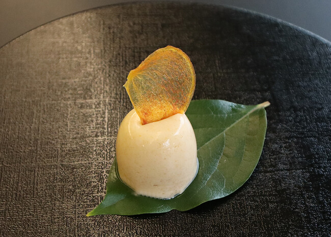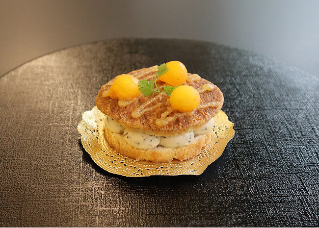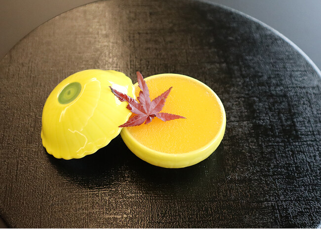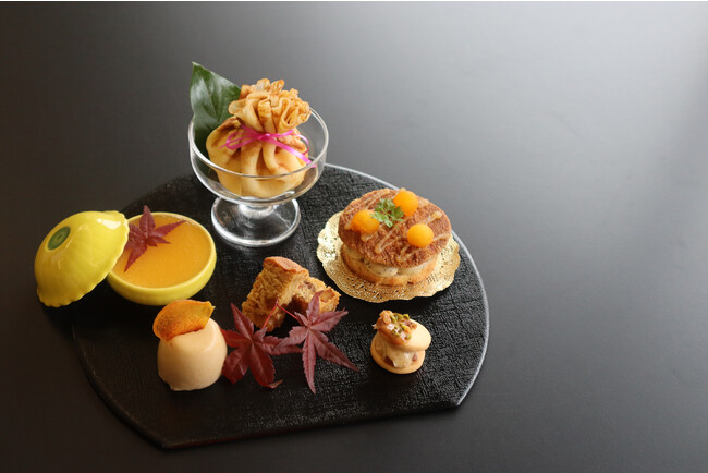 プレートには柿キャラメリゼのバターサンド、柿のクレープや柿のようかんなど洋から和テイストのスイーツ全6種類、柿が主役のスイーツが並んでいます。ひとつひとつパティシエが趣向を凝らして考案した「柿のデクリネゾン」は様々な仕立てから、新たな発見ができる楽しい逸品をお愉しみいただけます。