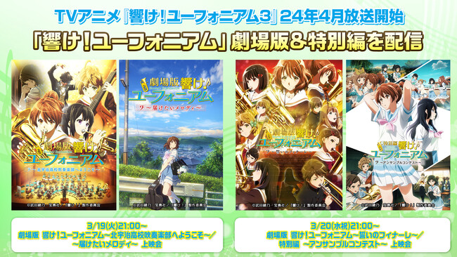 株式会社ドワンゴは、ライブ配信サービス「ニコニコ生放送」にて、TVアニメ『響け!ユーフォニアム3』の2024年4月NHK Eテレでの放送開始の特別企画として、アニメ『響け!ユーフォニアム』シリーズ劇場版&特別編計4作品を2024年3月19日(火)、20日(水)の2日間にかけて無料放送します。