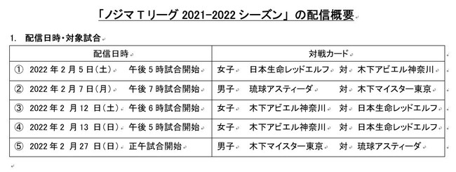 今回配信するのは、2022年 2月5 日(土)から2022年2月27日(日)までに行われる計5試合です。男子は「琉球アスティーダ」対「木下マイスター東京」、女子は「日本生命レッドエルフ」対「木下アビエル神奈川」の直接対決で、いずれも昨シーズンのプレーオフファイナルを戦った強豪チーム同士の戦いです。