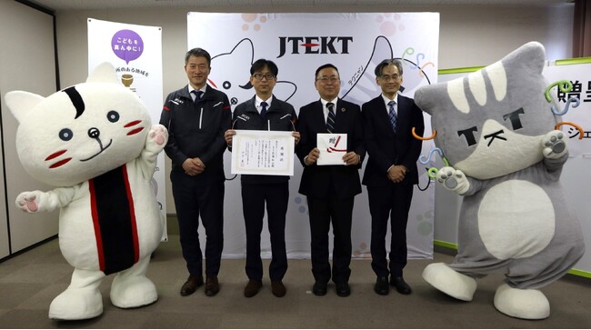 ジェイテクトと奈良県社会福祉協議会の寄付金贈呈式 左からジェイテクト公式マスコット「ジェイにゃん」、同奈良工場工務部 内田尚樹部長、同奈良工場 甲斐哲治工場長、奈良県社会福祉協議会 石井裕章常務理事、同 井ノ上晶事務局長、ジェイテクト公式マスコット「テクニャン」