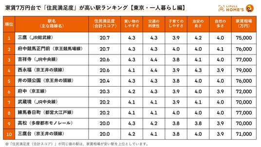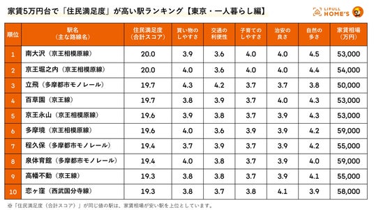 街の情報メディア『LIFE LIST』が、一人暮らし向けに“住民満足度”が高い東京の駅ランキングを家賃帯相場別に発表