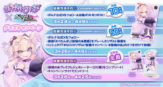 株式会社コナミアミューズメントは音楽シミュレーションゲーム『SOUND VOLTEX EXCEED GEAR(サウンドボルテックス エクシードギア)』(アーケード版およびコナステ版)と『ポラリスコード』にて、株式会社バーチャルエンターテイメントが運営するバーチャルYouTuberプロジェクト「ぶいすぽっ!」の『胡桃のあ(くるみのあ)』とのコラボレーションイベントを3月26日(水)から開催することをお知らせします。