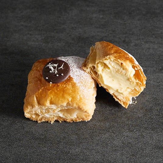香ばしく焼き上げた何層ものパイを割ると、ふんわり軽い生クリームをカスタードがとろり。