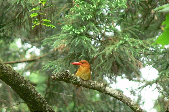 初夏、東南アジアから数千キロの旅をして全国の森に子育てをするために渡ってくる夏鳥で、カワセミの仲間です。全身は約27cmですが嘴が長いので見た目では20cmほどに見えます。全体が鮮やかな赤褐色、嘴は特に目立つ赤色で「キョロロロ」とキレイな声でさえずります。
