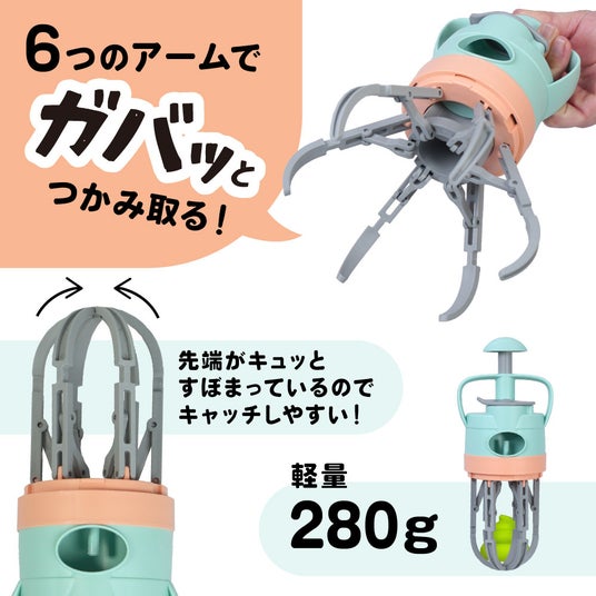 6つのアームが草むらや砂利の上でも対象物をしっかりホールドし、手を一切汚さずに回収から処理までを完結させます。