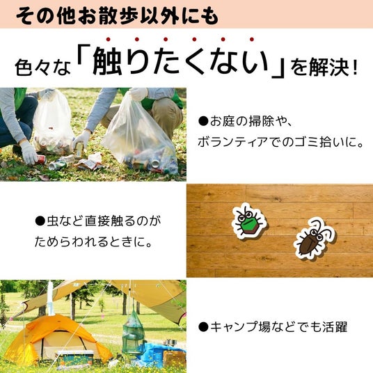ペットの散歩だけでなく、庭掃除やキャンプ、虫の処理など、直接触れるのをためらう様々なシーンで活躍します。