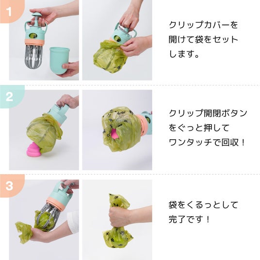 使い方は非常に簡単で、本体先端のクリップ部分に袋を被せ、ボタンを押して掴むだけ。