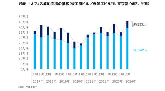 三幸エステートの公表データによると、2024年上期の東京都心5区のオフィス成約面積は45.9万坪(前年同期比+6.3%)と前年から増加した(図表 1)※2。新築ビルの供給減少に伴い、未竣工ビルの成約面積は6.4万坪(前年同期比▲25.3%)と減少したが、竣工済ビルは39.5万坪(同+14.1%)と増加した。コロナ禍が収束し、企業業績が堅調に推移する中で、リーシング活動は一層活発化している。