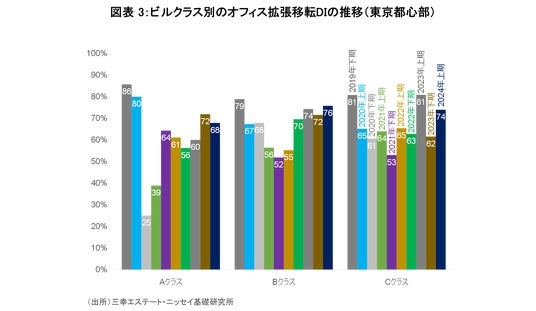 ビルクラス別のオフィス拡張移転DIを見ると、2024年上期はAクラスビルが68%、Bクラスビルが76%、Cクラスビルが74%と、概ね70%前後の水準となった(図表 3)※4 。コロナ禍において在宅勤務を積極的に導入した大企業ではオフィス需要が縮小し、特にAクラスビルの拡張移転DIは著しく低下した。しかし、好調な企業業績などを背景に、オフィス拡張ニーズが幅広い企業で見られるようになり、ビルクラス間におけるオフィス需要の差異は、ほぼ解消されつつある。