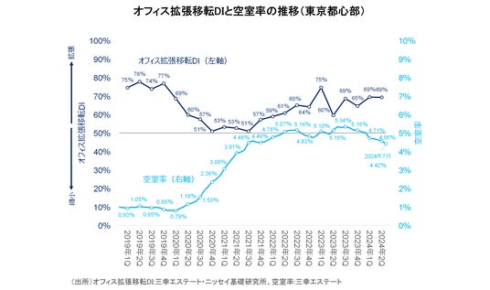 本稿では、共同研究の一環として算出した「オフィス拡張移転DI」を中心に、2024年上期の東京オフィス市場の動向を発表いたします。