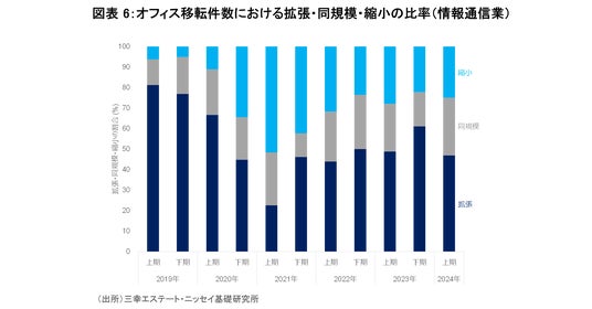 一方、情報通信業や学術研究・専門/技術サービス業では、オフィス需要が大きく落ち込んでいるわけではないものの、ハイブリッドワークの普及に伴うオフィス床削減の動きが続いており、コロナ禍前のような力強さは見られない。例えば、情報通信業におけるオフィス移転件数の比率(2023年下期→2024年上期)を見ると、拡張移転が「61%→47%」、同規模移転が「17%→28%」、縮小移転が「22%→25%」となり、縮小移転の割合は全体の4分の1程度で下げ止まっている(図表 6)。