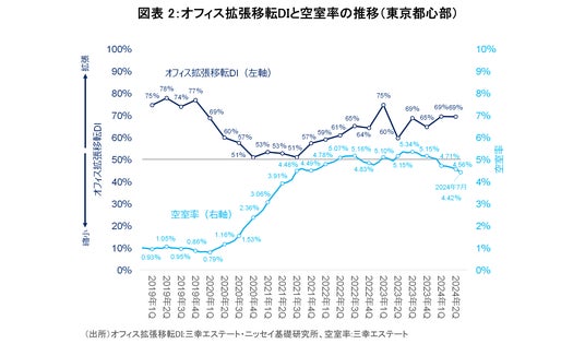 東京都心部のオフィス拡張移転DIは、2024年第1四半期および第2四半期はともに69%となった(図表 2)※3。2023年第1四半期以降、70%前後で推移したが、2023年は新築ビルの供給が多かったため、空室率は概ね横ばいで推移していた。一方で、2024年は新規供給が減少したことで、空室率は2023年12月の5.15%から2024年7月には4.42%へと低下した。オフィス市況が絶好調だった2019年には、拡張移転DIが70%台後半で推移していたことから、この時期ほどには至らないものの、底堅いオフィス需要は継続しており、オフィス市場は回復局面に入ったと考えられる。