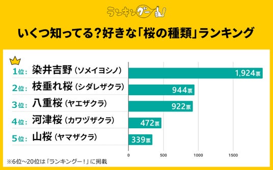 ランキングー!では好きな「桜の種類」をピックアップし、ランキングを調査。全年代の男女(性別回答しないを含む)8,924名にアンケートを行い、TOP20を決定しました。ここではTOP5をご紹介します。