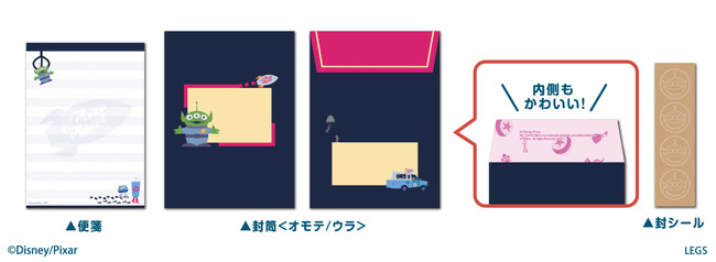 レターセットBは、宇宙を連想する深い紺色をベースに、ピザ・プラネットにいる「エイリアン」をメインとしたデザイン。便箋にはピザ・プラネットに侵入を試みる「ウッディ」と「バズ・ライトイヤー」の姿が!わかる人にはわかる通なデザインです。