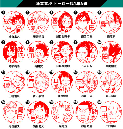 緑谷出久や爆豪勝己、麗日お茶子、相澤消太、オールマイトなど選べる47種類。予約開始からSNSで大きな反響をいただいた「ヒロアカ」のはんこ。荷物の受け取りやサインがわり、子どもの連絡帳や銀行登録にも。