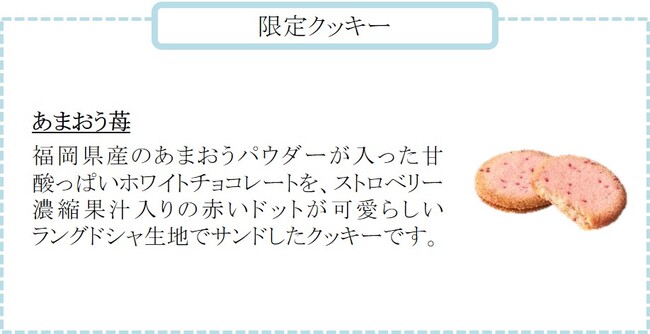 福岡県産のあまおうパウダーが入った甘酸っぱいホワイトチョコレートをストロベリー濃縮果汁入りの赤いドットが可愛らしいラングドシャ生地でサンドしたクッキーです。サクッとした口あたりと、風味豊かなチョコレートのハーモニーをお楽しみください。