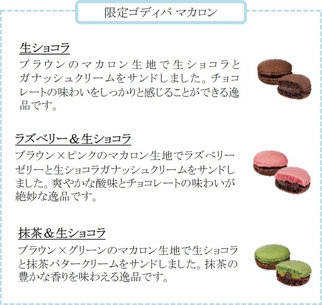 ゴディバがチョコレートの味わいにこだわって作ったチョコレートを楽しめるマカロンです。外はサクサク、中はしっとりとした食感のマカロン生地で、生ショコラをサンドしたこだわりのマカロンです。「生ショコラ」「ラズベリー&生ショコラ」「抹茶&生ショコラ」の3種類のフレーバーを詰め合わせました。