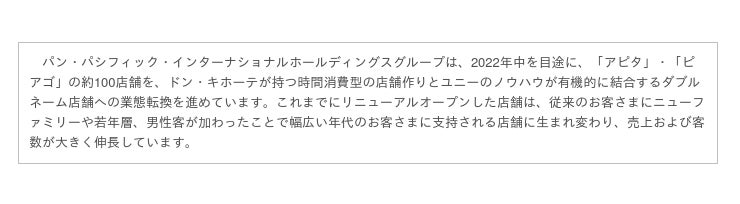 今回、業態転換するアラタマ店は、「MEGAドン・キホーテ」及び「ピアゴ ラ フーズコア」の強みを存分に活かした商品を豊富に取り揃えるとともに、「ドン・キホーテ」ならではのトレンドを意識した感性豊かな商品とPOPなどの空間演出で、お客さまにお買い物の『ワクワク・ドキドキ』を提供する店舗空間を創造します。