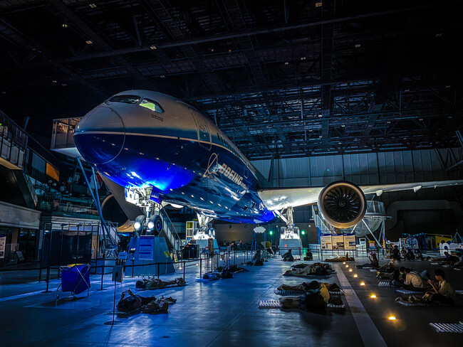 同施設に展示してあるボーイング787初号機の真下で、災害備蓄品のエアマットを敷いて宿泊いただきました。