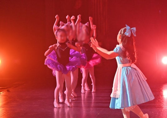『不思議の国のアリス』では、カラフルな衣装や華やかな舞台装置、プロジェクションマッピング…とまるで公演のような豪華な舞台。舞台構成や振付もコミカルで見どころが沢山あり、観客がアリスの世界観にどんどん引き込まれていく作品になりました。