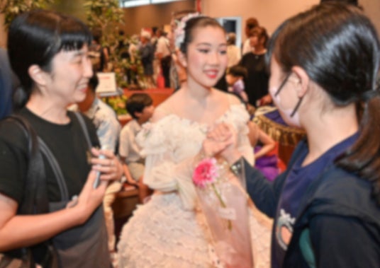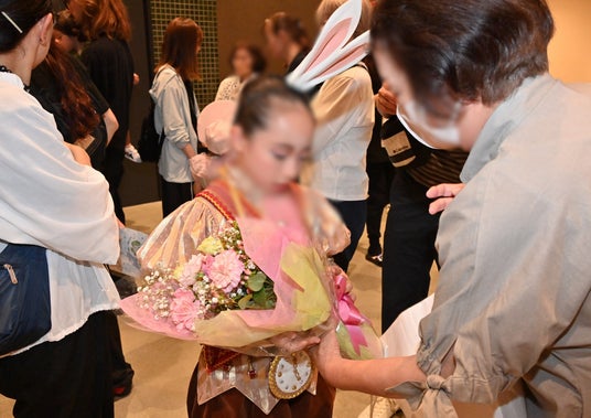 終演後はホワイエにて、出演者が観に来てくださったご家族やお友達などに会える事もスタジオマーティバレエスクール発表会の醍醐味の一つ。プレゼントをもらったり、記念写真を撮ったり、お話したり、ホワイエがとても賑わいます。