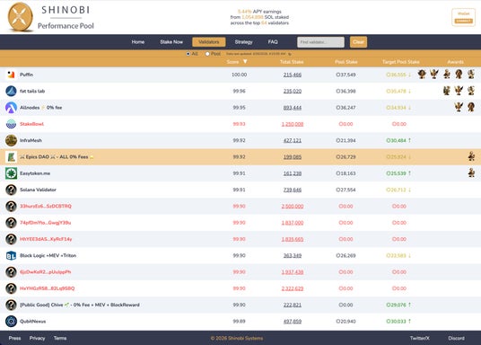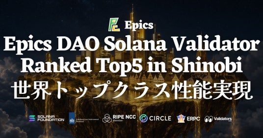 ELSOUL LABO B.V.(本社:オランダ・アムステルダム、代表取締役 CEO:川崎文武)および Validators DAO が運営する ERPC は、ERPC の SWQoS エンドポイントおよび Epic Shreds の配信元として運用している Epics DAO バリデータが、Solana ステーキングプール「Shinobi Performance Pool」においてトップ5入り(5位・スコア99.92)を達成したことをお知らせいたします。あわせて、プール対象外のスーパーマイノリティ級の大規模バリデータを含めた全 Solana バリデータの中でも、6位のパフォーマンスを記録しています。