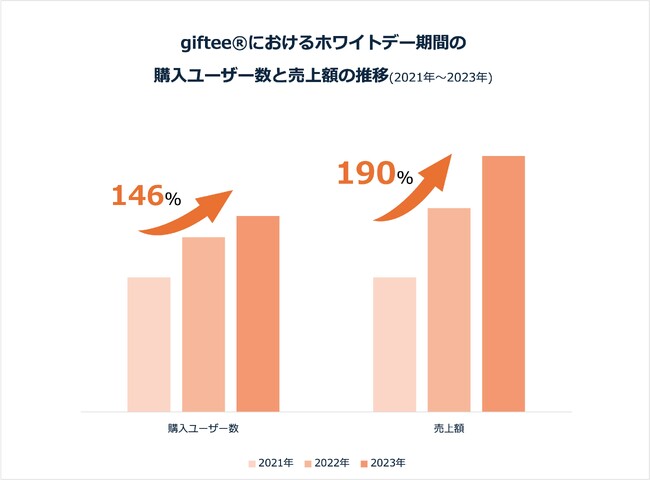 ■2023年のホワイトデー期間における売上は2021年同期比で190%増加、購入ユーザー数および平均購入単価も大きく伸長