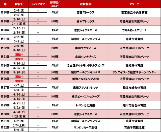 ※第23節vs京都ハンナリーズ戦、第26節vs新潟アルビレックスBB戦(@府民共済SUPERアリーナ)の試合日、ティップオフ時間につきましては、12月以降に発表を予定しております。
