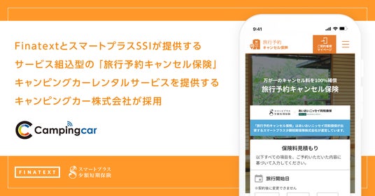 次世代金融インフラの提供を通して組込型金融を実現するFinatextグループの株式会社Finatext(本社:東京都千代田区、代表取締役CEO:木下 あかね、以下「Finatext」)と、株式会社Finatextホールディングス(本社:東京都千代田区、代表取締役社長CEO:林 良太)およびあいおいニッセイ同和損害保険株式会社(本社:東京都渋谷区、代表取締役社長:新納 啓介)が出資するスマートプラス少額短期保険株式会社(本社:東京都千代田区、代表取締役:小山 宏人、以下「スマートプラスSSI」)は、両社が提供するサービス組込型の「旅行予約キャンセル保険」が、キャンピングカー株式会社(本社:東京都渋谷区、代表取締役社長:頼定 誠、以下「CCKK」)に採用されたことをお知らせします。