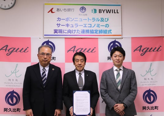 「GXをやりたくなる世界」を目指し、環境価値を活用した経済循環を推進する株式会社バイウィル(本社:東京都中央区、代表取締役社長:下村 雄一郎、以下「バイウィル」)は、愛知県阿久比町(町長:田中 清高、以下「阿久比町」)、株式会社あいち銀行(本店:愛知県名古屋市、代表取締役頭取執行役員:鈴木 武裕、以下「あいち銀行」)と、「カーボンニュートラル及びサーキュラーエコノミーの実現に向けた連携協定」を締結しました。