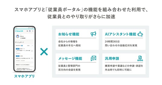 「従業員ポータル」の機能と掛け合わせることで、スマホアプリを起点に、従業員が迷わない・業務が止まらない体験を実現