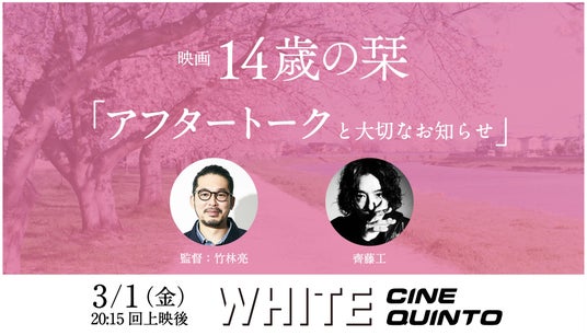 CHOCOLATE Inc. (本社:東京都渋谷区、代表取締役:渡辺裕介)は、弊社企画・製作による長編映画作品『14歳の栞』(配給:PARCO / 監督:竹林亮)の3度目となる再上映開始に合わせ、齊藤工さんをゲストに迎えたトークイベントを3月1日に渋谷パルコ8F ホワイトシネクイントにて開催することをお知らせいたします。本作の監督を務めた竹林亮と、自身も映画監督として活動されている齊藤工さんが登壇し、作品上映後のアフタートークと“大切なお知らせ”を行います。