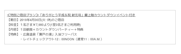 2019年夏に開業25周年を迎える、空と海に囲まれたアイランドリゾート「グランドプリンスホテル広島」(所在地:広島市南区元宇品町23-1 総支配人:平瀬春男)では、23階スカイラウンジ トップ オブ ヒロシマにて、2019年4月30日(火・休)に、改元の瞬間を祝い迎える「新元号カウントダウンパーティー」を開催いたします。