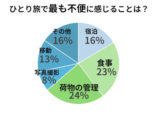 旅行中にひとりで不便に感じるシーンとして、もっとも多かった回答は、ほぼ同率で「荷物の管理」と「食事」。荷物が増えた時の移動やトイレに行く際などで、荷物の管理に不便さを感じている人が多いようです。また食事においては、ひとりでも入りやすいお店を見つけるのに苦労する、という意見や、ひとりだと料理をシェアできないため、食べられる品数が限られてくるという意見が多く見られました。