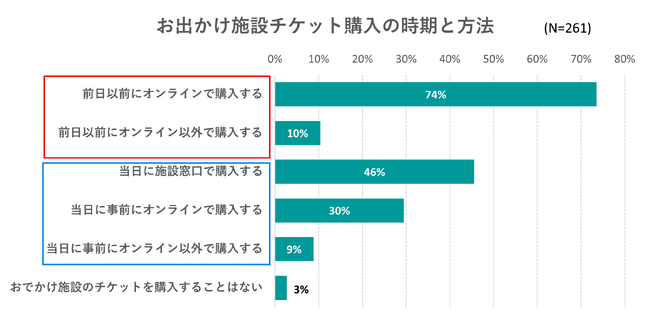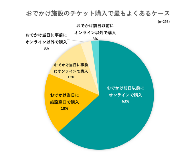 チケットが必要なおでかけ施設へ出かける際、購入時期と方法として非常に多かったのは、「前日以前にオンラインで購入する」というものでした。