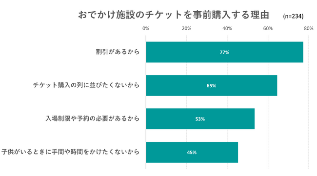 そのつぎに、「チケット購入の列に並びたくないから」という理由が続いています。入場の際、少しでも混雑や待ち時間を避け、施設で楽しむ時間を充実させたいと望む人が多いことが伺えます。