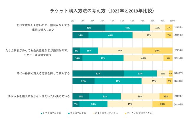また、「常に安く買える方法を探す」という人が増えている一方で、「チケットを購入するサイトはだいたい決めている」という考えも増えており、少しでも安く買える方法を探しつつも安く買えるお気に入りのサイトや方法などを確保している様子が伺えます。