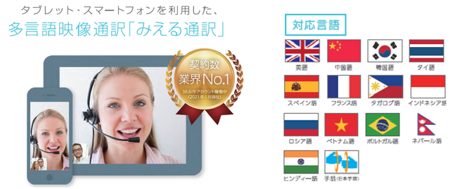「みえる通訳」は、タブレットやスマートフォンを使い、いつでもどこでもワンタッチで、通訳オペレーターにつながりお客さまとの接客をサポートする映像通訳サービスです。同サービスは業界最多の13か国語に対応しており、手話通訳(日本手話)も全プラン標準対応していることから、業種・業態を問わず広く利用されています。
