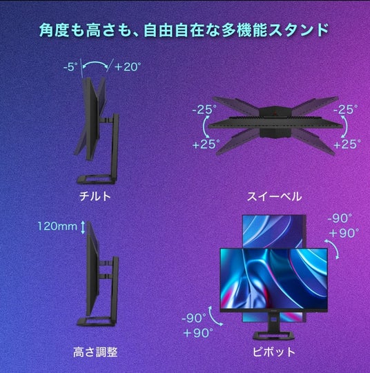 多機能スタンドで角度や高さが自由自在、壁掛けやアームの取り付けも可能