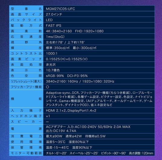 4K(160Hz)とFHD(320Hz)の切り替え可能、ゲームに最適な映像体験へ