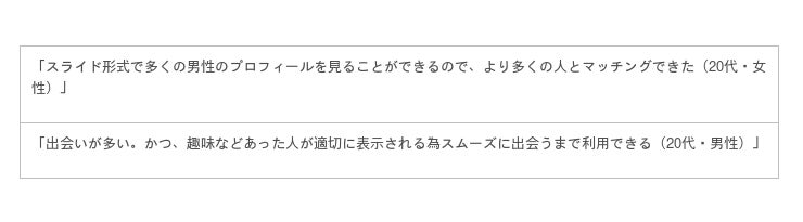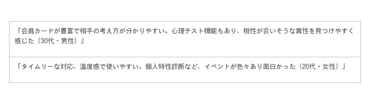 総合2位の【tapple(株式会社タップル 本社:東京都渋谷区)】は、“会員アプリ(サイト)のページの見やすさやメッセージのやり取りのしやすさ”などを評価した項目「アプリの使いやすさ」と目的別「恋活目的」部門で、初の1位を獲得しました。