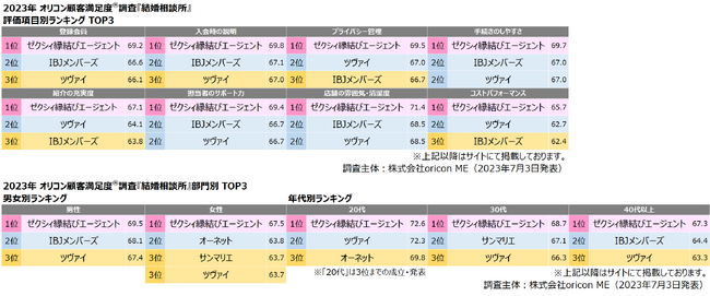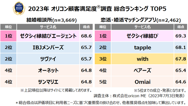 実際のサービス利用者を対象に第三者の立場で顧客満足度調査を実施する株式会社oricon ME(本社:東京都港区 代表取締役社長:小池 恒 略称:オリコン)は、『結婚相談所』『恋活・婚活マッチングアプリ』についての満足度調査を実施し、2023年7月3日(月)14時にその結果を「オリコン顧客満足度(R)」公式サイト内( https://life.oricon.co.jp/ )にて発表いたしました。ランキングの結果は、下記の通りとなりました。