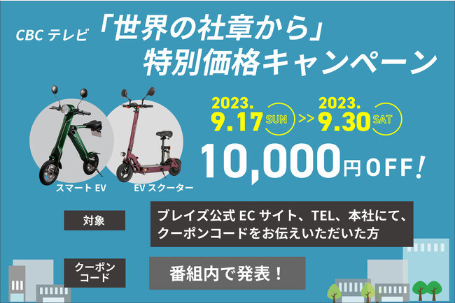 株式会社ブレイズ(愛知県名古屋市、代表取締役:市川秀幸、以下ブレイズ)は、2023年9月17日(日)に放送されるCBCテレビ「世界の社章から~気になるカイシャに途中下車~」に登場し、番組をご覧になった方を対象とした電動バイクの特別価格キャンペーンを実施いたします。