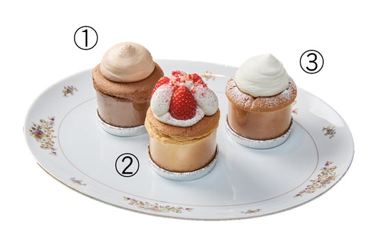 <やさしいセカイ>とろふわシフォンクリーム 1.ショコラ (1個) 650円 2.イチゴ (1個) 800円 3.プレーン (1個) 600円