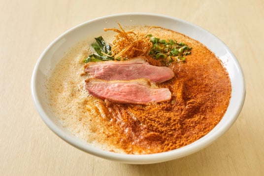 店自慢の鴨とあさりの出汁を ベースにした白湯スープ(白)に、 道産の海老を焼いて作った海 老パウダー(赤)と、鴨肉のフィ レチャーシューをトッピング。