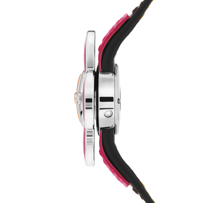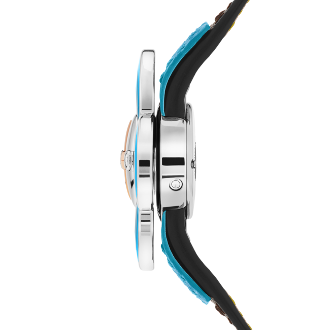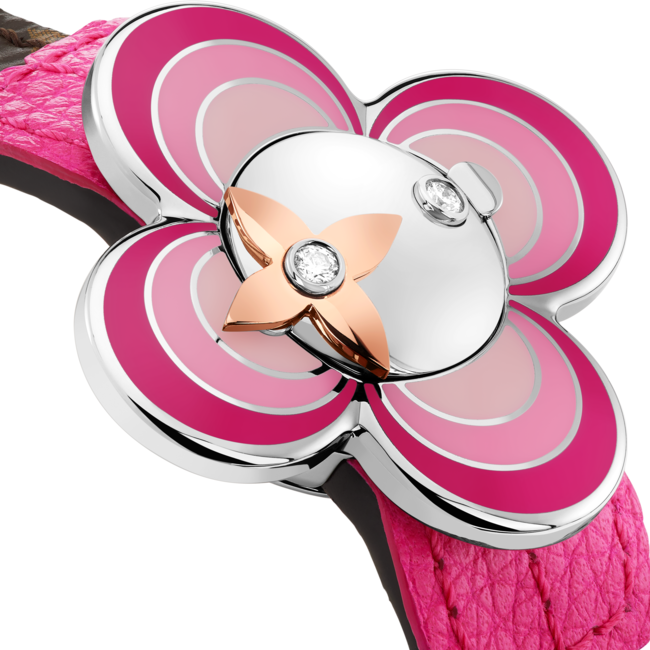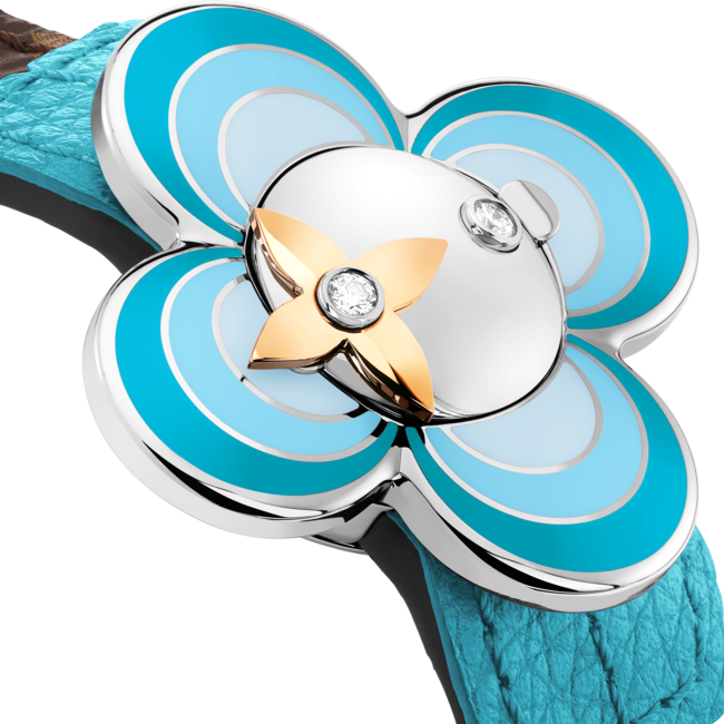 2021年に発表されたハイウォッチ「タンブール スピン・タイム エアー ヴィヴィエンヌ」、「ヴィヴィエンヌ ビジュ シークレット」に続く本作は、目を引く鮮やかなグラデーションカラーのブルーとピンクの2色展開。ポリッシュしたステンレススティールにダイヤモンドとゴールドをあしらうことで「ヴィヴィエンヌ」の愛くるしい表情を再現し、その顔をスライドさせると、メゾンのウォッチメイキングアトリエ「ラ・ファブリク・デュ・タン ルイ・ヴィトン」の熟練した職人によるラッカー加工のモノグラム・フラワーがデザインされたダイアルが現れます。メゾンのサヴォアフェール(匠の技)とクリエイティビティ、そして遊び心が見事に融合したユニークなシークレットウォッチです。
