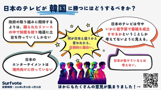 社会課題や困りごとの解決に誰でも安心して参加できるSNS「Surfvote」の意見募集、「政府による積極的な支援策が必要」という意見と、「日本のテレビは韓国に勝つ必要はない」を選択した人の割合が同数。