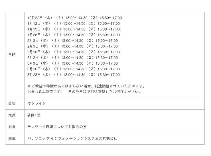 パナソニック インフォメーションシステムズ株式会社は、2021年12月22日(水)から2022年3月23日(水)にかけて各回1社限定の、VDI乗り換え・無料オンライン個別相談会を開催します。