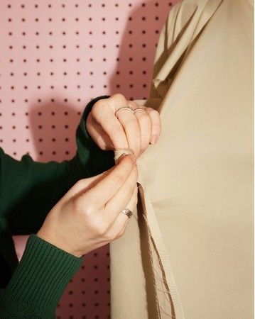 「ファブリックは、デザインの中で最も重要な要素のひとつです。ベースとなるものだからです。今回のイニシ アチブでは、ストレッチウールのドレープや、手織りや編み込みのロープと組み合わせて、世界にひとつだけの 作品を作るという実験ができました。今後このイニシアチブのおかげで、デッドストックの素材を再利用して 使い続けるという、よりサステイナブルなアプローチで作品作りができるようになります。」