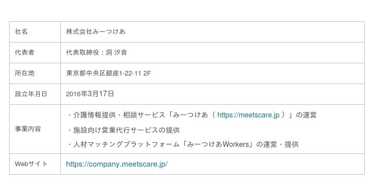 株式会社みーつけあは「Best care and smile」の実現をミッションとして、介護に関わる全ての方が豊富な情報を元により良い介護ができる、新しい介護の世界の実現を目指しています。